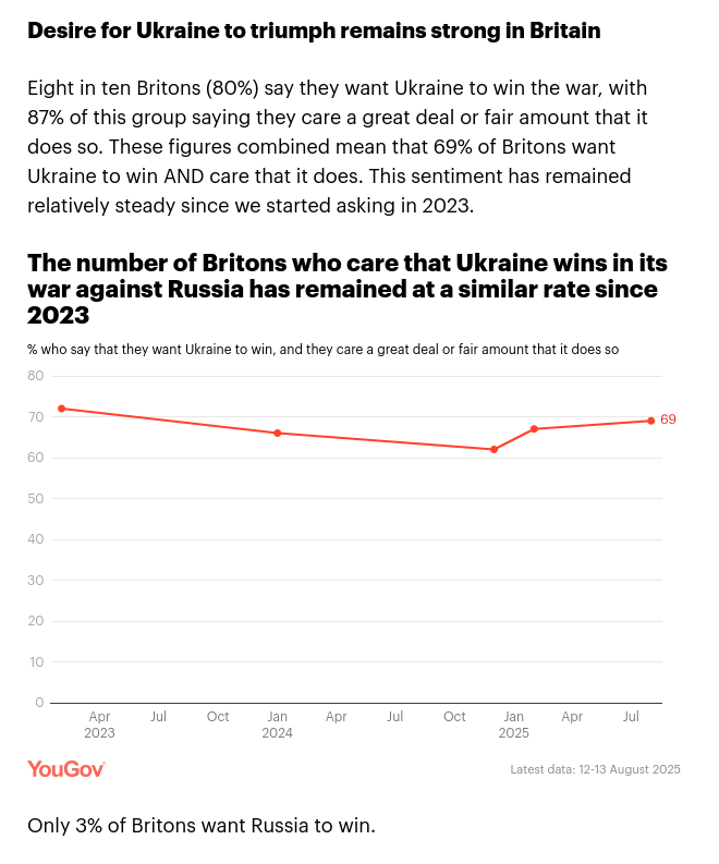 >>521980562He's probably either a Russian on a VPN, or he's a British shut-in. 80% of Brits want Ukraine to win this conflict, and only 3% of Brits want Russia to win. Pic related. Source:https://yougov.co.uk/politics/articles/52766-where-do-britons-stand-on-ukraine-ahead-of-the-trump-putin-peace-meeting-in-alaska
