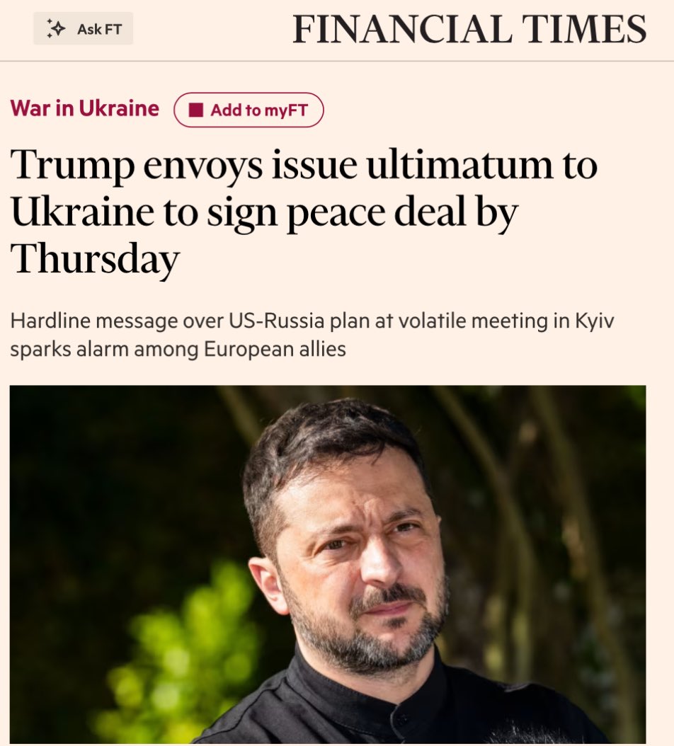 I guess now we know what trump means by this war wouldn't have ever started if he was in office, he'd just force Ukraine to surrender - that pretty much checks out with his worldviewand is it me or is Trump crashing out this week? more so than usual, epstein vote, china rare earths, ms piggy, polls doing badly for him. I think this is one of those absurd Trump demands that doesn't hold up beyond a few days