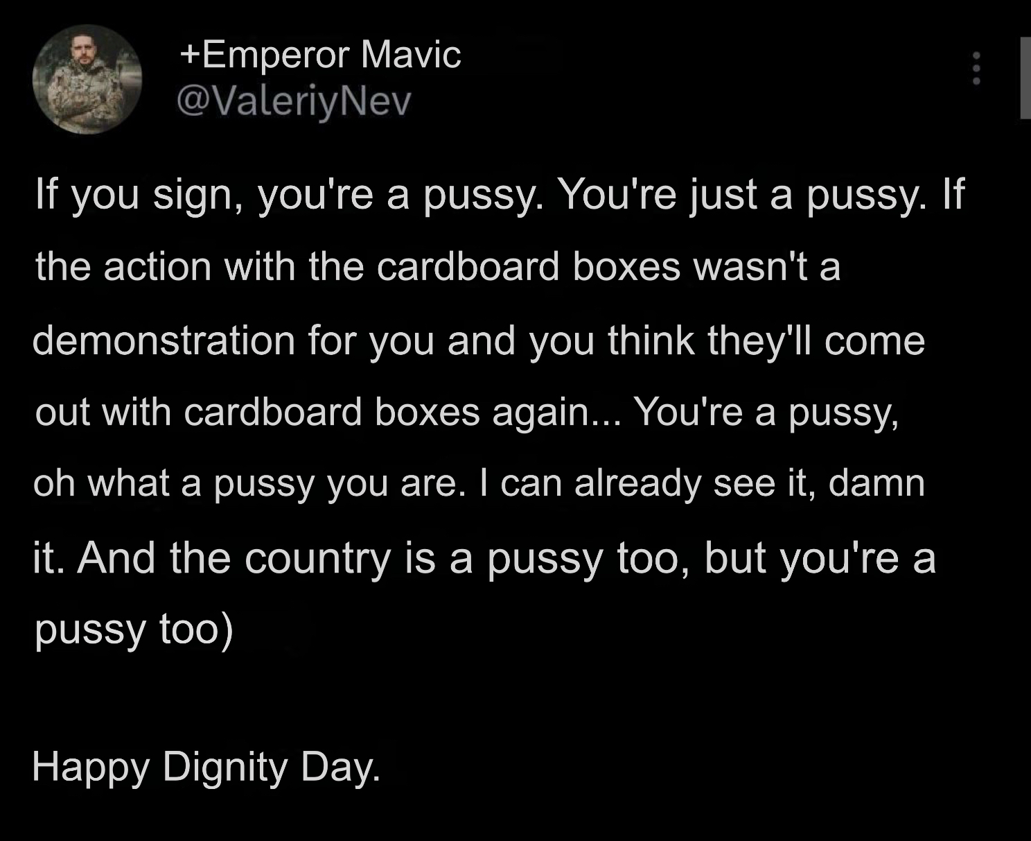 Calling this peace deal a "betrayal" is so weird. Nobody in the US, including me, don't give a fuck about Ukraine. I don't know anyone in Ukraine, and frankly, glad I never will. Imagine thinking I give a fuck about some spaz, with a Ukrainian flag, crying about us not helping them.You're a stranger who I will never meet, and whose life I could not care less about.From the bottom of my heart, fuck you and your entire country.