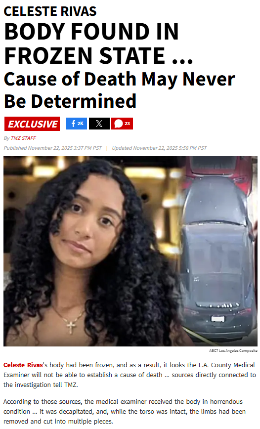 >>522036560>She was frozen in a car left out in the open sun of LA. How does that make any cents?Depending on order of operation, it's simple.First the dismemberment, then either the freezing the remains in a deep freezer then putting in the car to rot latter or rot first in the car remove and put in deep freezer after, which does the police say?