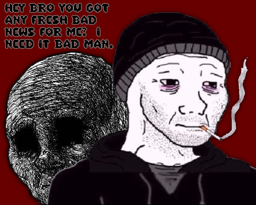 >>522033731people 'red pilled' themselves too hard and now are 99% demoralized and they refuse to back out of that state unless trump deports 100 million brown people and hangs Bibi from a cross in the Whitehouse lawn. meaning - nothing will satisfy them at this point.