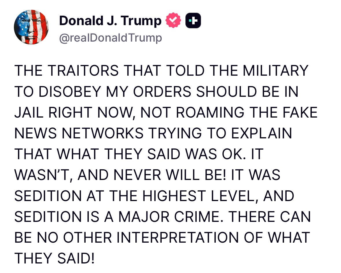>>522037391Good thing they didn't tell them to disobey orders, just the ones they know are illegal. Seems like a sensible message. The only reason for Trump to get mad is if he himself was considering issuing orders he knows to be unlawful. Just like with the Epstein stuff, his anger gives away his guilt.