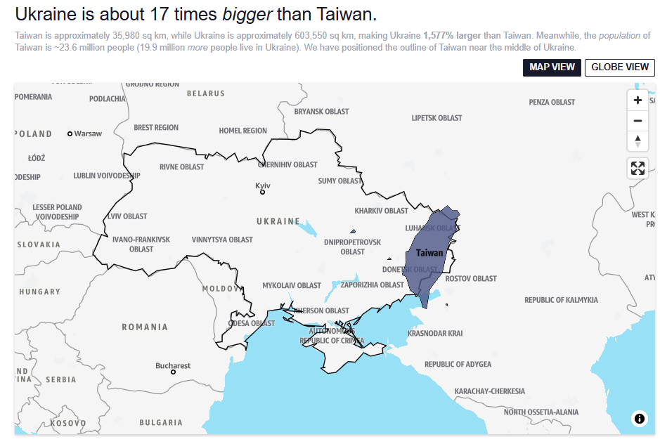 1. Trade "ceasefire" between the US and China indicates that US can't sanction China or it would collapse.They rely on Chinese rare earths and Taiwanese chips.2. The West is busy with Ukraine3. China has superiority over the Chinese sea, + hypersonics + drones + nukes. The American fleet could be wiped out with ease. Imagine a combined attack with hypersonics, nukes, 10.000 Geran style drones, torpedoes from submaines, 5th generation planes, etc. over whatever carrier groups they have there.4. The US RECOGNIZES Taiwan as a PART OF CHINA, as do 99% of the world. Only 11 "countries" don't recognize Taiwan, the biggest of them being Paraguay, Guatemala and Haiti. The rest are fake countries with 20k inhabitants such as Palau or the Vatican.5. China would still sell chips and rare earths to the US. No problem. In fact, after Taiwan is taken, the US doesn't need China as an enemy, they could be allies.6. The taiwanese are learning from the Ukrainians.So China could surround Taiwan and take it any day now.