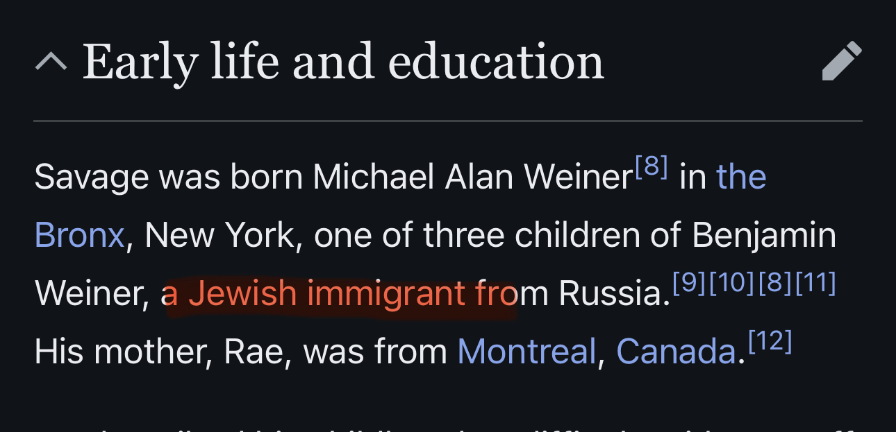 >>522061679this is only a revelation if you are under the age of about 40 and never listened to him on the radio. He freely spoke about his parents being Jewish immigrants from Russia during the Oy Vey-ening of the 1890s. Savage has been his nom de plume since his early days on SF talk radio in the early 90s