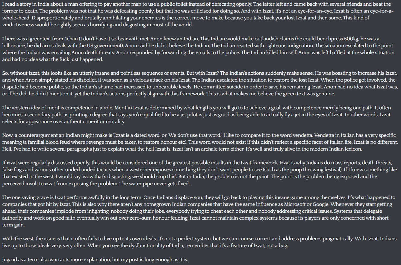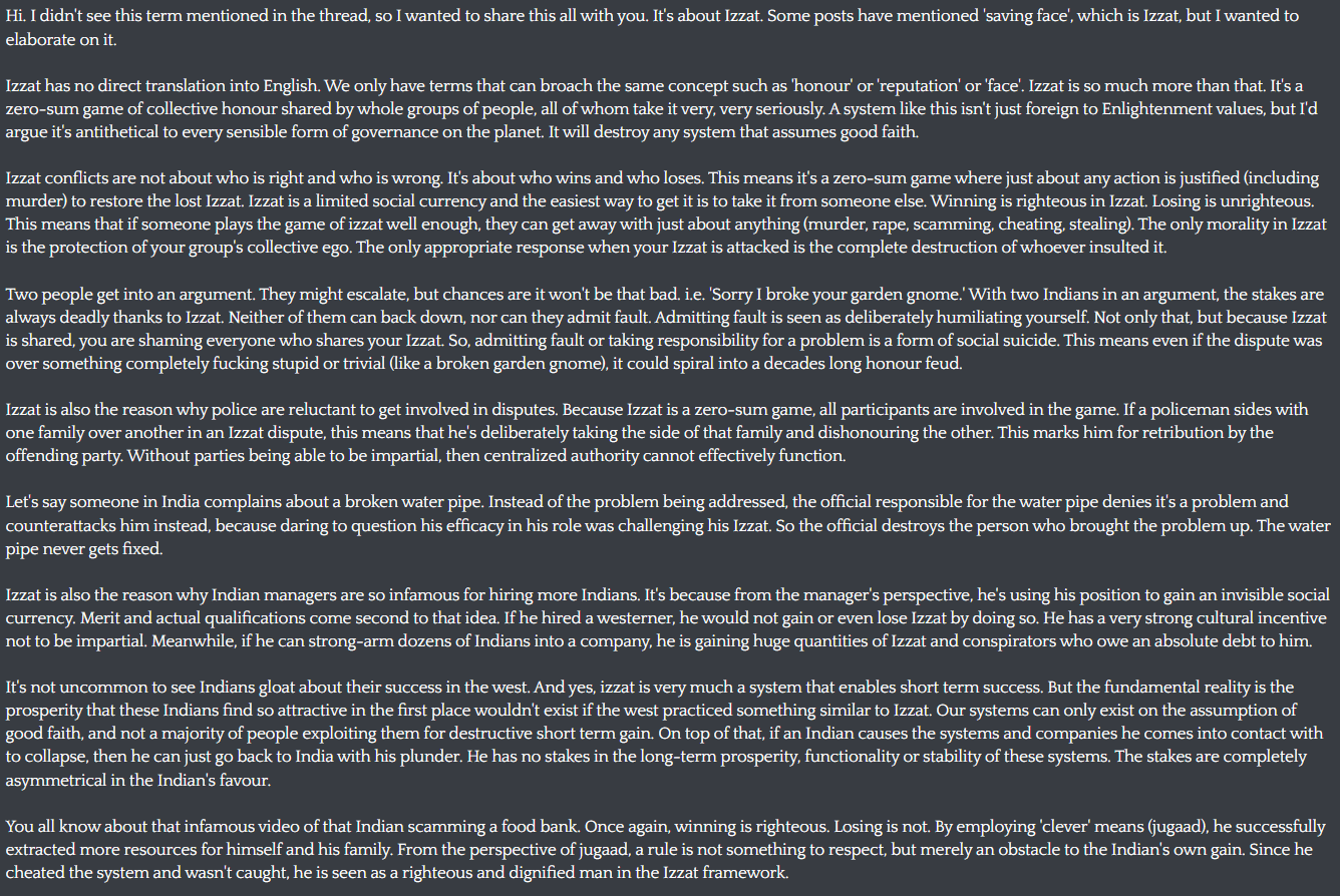 >>522066452The is what Indians actually believe. If there isn't a law or rule in place, they're doing no wrong by harming others, it's the system the victims should be angry at. They're genuinely confused why you'd be mad at them, and think you're stupid for assigning them the blame. If there IS a law or rule in place, and they can circumvent it, even just in the short term (e.g. stealing a motherfucking driveway, but later being caught for this crime), they view this as a success and something akin to what humans consider an ethical good, although jeet "ethics" bear little relation to actual right and wrong.