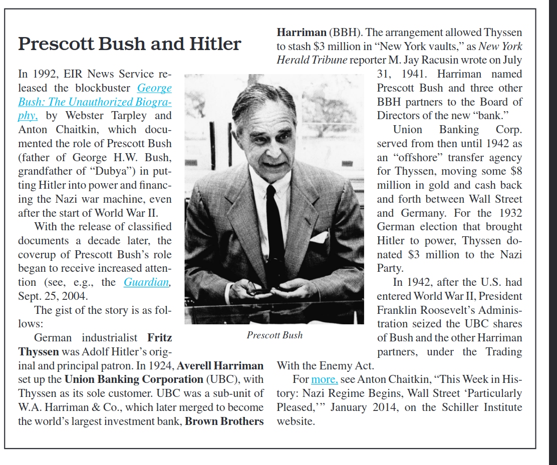 Prescott Bush's (Father and Grandfather of two future US Presidents) business interests in Germany suffered after the outbreak of the Second World War. On 20th October, 1942, the United States government seized the assets of the Union Banking Corporation. The shares of the bank were owned by Prescott Bush, E. Roland Harriman, and a couple of members of the Nazi Party. Under the Trading with the Enemy Act, the government took over the Union Banking Corporation and the Silesian-American Corporation, a company that had been managed by Prescott Bush and his father-in-law George Herbert Walker.>The Union Banking Corporation (UBC) was a New York investment bank incorporated in 1924. >The now-former U.S. Senator Prescott Bush was a founding member and is included among its seven directors whose entire collective shareholdings in Union Banking Corp were shares wholly owned by, and held on behalf of, the Thyssen empire's Bank voor Handel en Scheepvaart in Rottendam.>Bank voor Handel en Scheepvaart N.V. was a Dutch bank that provided financial services for the House of Orange-Nassau and German industrialist and financier of Adolf Hitler, Fritz Thyssen>House of Orange-Nassau>It was founded in 1916 by August Thyssen.>One of its subsidiaries was the American bank Union Banking Corporation. The funds for Hitler's Brown House (The headquarters of the National Socialist German Workers' Party) were routed through Bank voor Handel en Scheepvaart and Union Banking Corporation.>In August 1946, the clandestine Operation Juliana was organized to re-appropriate the Orange-Nassau stock portfolio that had been transferred to Berlin.>Prior to the Second World War, Thyssen used Bank voor Handel en Scheepvaart to route iron imports destined for Vereingte Stahlwerke AG into Germany.>The bank was later converted into TBG AG by heir Hans Heinrich Thyssen-Bornemisza.