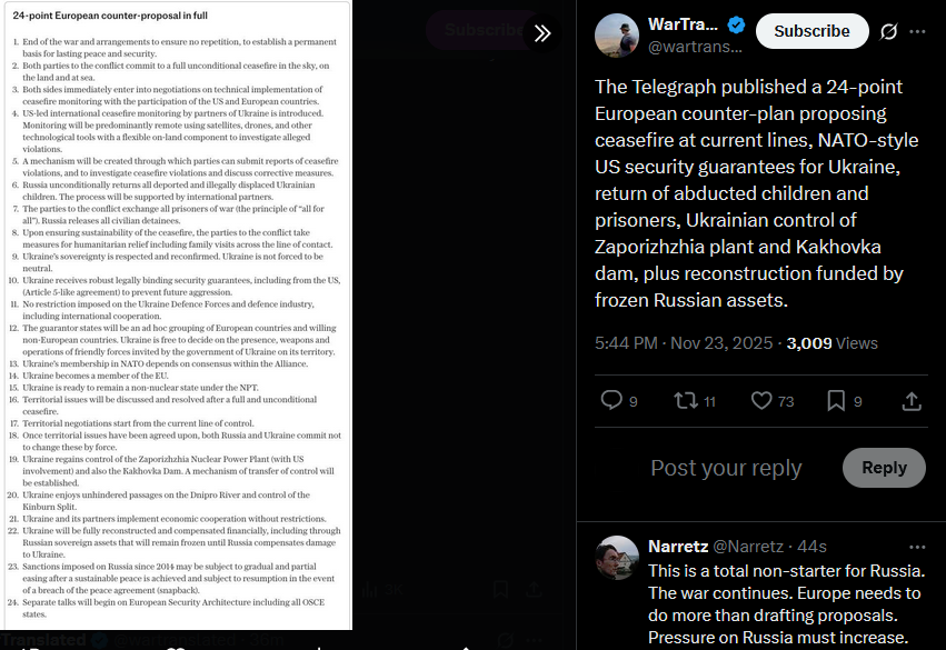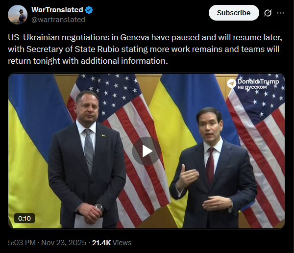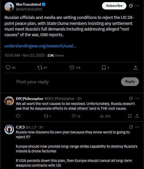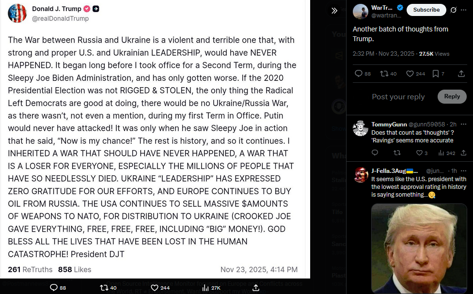 Another batch of thoughts from Trump.https://x.com/wartranslated/status/1992602237533569303?s=20