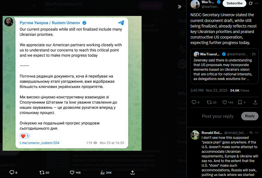 >>522071483NSDC Secretary Umerov stated the current document draft, while still being finalized, already reflects most key Ukrainian priorities and praised constructive US cooperation, expecting further progress today.https://x.com/wartranslated/status/1992605551671529558?s=20