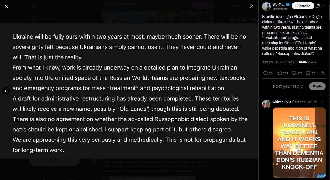 Kremlin ideologue Alexander Dugin claimed Ukraine will be absorbed within two years, stating teams are preparing textbooks, mass "rehabilitation" programs and renaming territories "Old Lands" while debating abolition of what he called a "Russophobic dialect".https://x.com/wartranslated/status/1992612427801014447?s=20op pichttps://files.catbox.moe/hoofyj.jpg>toasty hot Daughter