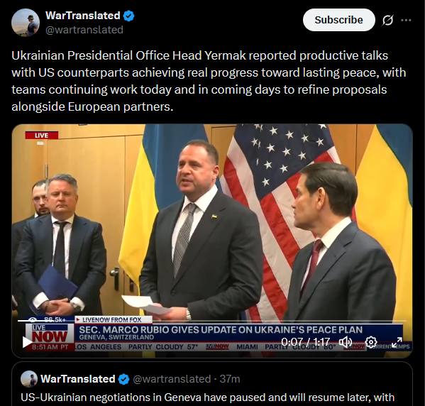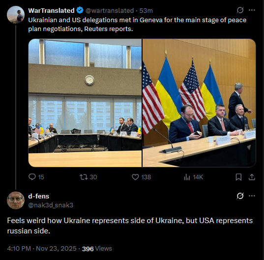 >>522072893 still not listed, lol>>522072233Ukrainian and US delegations met in Geneva for the main stage of peace plan negotiations, Reuters reports.https://x.com/wartranslated/status/1992625983212368159?s=20pic 1https://files.catbox.moe/op5hij.jpgpic 2https://files.catbox.moe/wg48r0.jpg