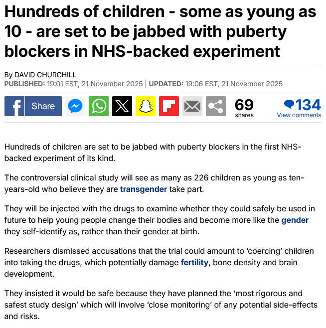https://www.dailymail.co.uk/news/article-15314427/Hundreds-children-set-jabbed-puberty-blockers-NHS-backed-experiment-kind-controversial-clinical-study-226-children-young-ten-years-old-believe-transgender-injected-drugs-examine-safely-used-future-help-young-people-change-bodies-like-gender-self-identify-gender-birth.html?ito=social-twitter_mailonline&ns_campaign=1490&ns_mchannel=rss