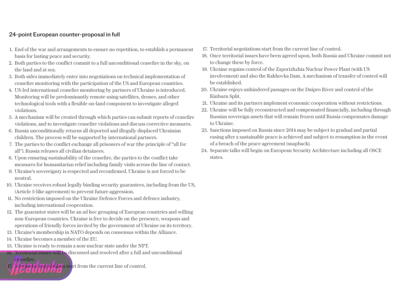 The counter-proposal was drafted by the so-called European E3 powers - Britain, France and Germany, a source familiar with the document said.Key points:-The Ukraine can join NATO-The Ukraine is free to have whatever foreign military presence it wants-The Ukraine army is not limited in any way be it size or it's weaponry, including weapons "cooperation" with EU and US countries.-Russia pays reparations 300 billions minimum-The Ukraine get Zaporozhie power plan back under its control and also Kakhovka dam-First hostilities freeze along current line of contact and only later talks begin.Looks like very balanced offer, I'm sure Russia will agree.