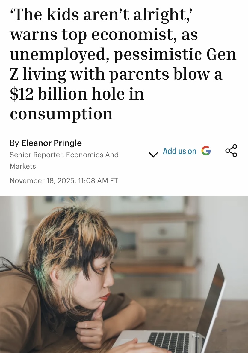 >Obliterate the jobs market with outsourcing and importing people from around the world over the last 50 years>Over the last 30 years made everything extremely expensive.>Gen Z have only lived in a world of Not-War. Not-War in the middle east, that finally ended after 20 years....and right away Russia invades Ukraine and shortly after Gaza explodes. We are teetering on the brink of WW3>WTF?! WHY IS GEN Z SO PESSIMISTIC AND JOBLESS?! THEY NEED TO THINK OF OUR EXPONENTIAL, YEAR OVER YEAR GROWTH! Welcome Gen Z, you are now adults. The (((Economist))) Boomers will spend the next 10-15 years blaming you for every single economic issue. They've done this since Gen X.