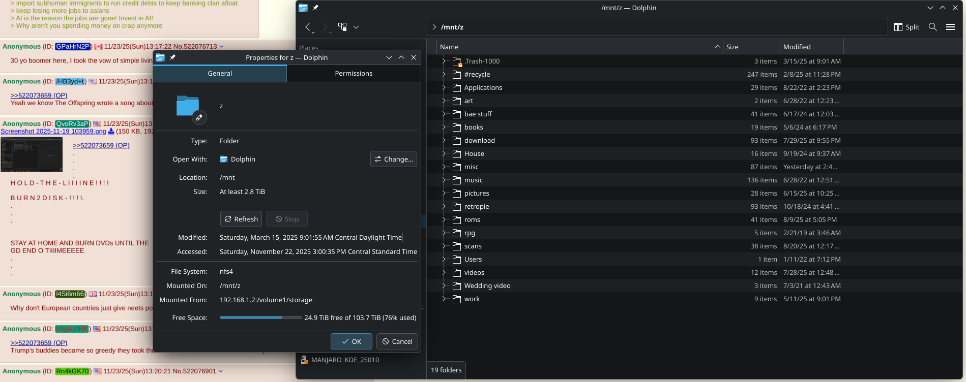 >>522077429still looking into it, but seems expensive and not really all that different from just having back up HDDs, which I already had and lost (all at once).Setting up one's "own server" doesnt sound like an advantage to me, if you drop a HDD you can lose 16 TBs at once. if you drop a book of dvds, nothing. and the redundancy is the same seems like, you are still just making copies and sacrificing storage space(?), same as with DVDs. main pro is organization, sheer amount of storage and ease of use. imo?I mean thats not nothing. so..but whats the advantage if 20 -100 Tbs are all wiped at once, back ups of back ups? Thats what happened to me and it was indeed "catastrophic". Like having 10 years of my life wiped out! Everything but the DVDs and CDs I had burned before getting into multiple, (unconnected) HDDs and SSDs.Ive seen these types of set ups online and they just seem like good money after bad, after what Iver gone through. I'll stick with my slow but secure 100 DVDs a week, totally unorganized books and etc.Cool screenshot though, thats an amazing amount of storage. Would be cool browsing a huge library like that, assuming you had similar tastes, like we used ta do with Limewire and etc.