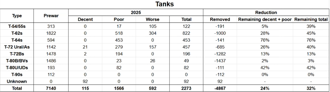 NEW COVERT CABAL TANK COUNTING VIDEO:https://www.youtube.com/watch?v=e_Ft1-pLm5A>tl:dr>count spans from early 2025 to today>44 T-54/55s have disappeared>260 T-62s have disappeared>200 T-64s have disappeared>452 T-72A/Ural have disappeared,40% of the PRE-WAR stockpile just got evaporated>237 T-72Bs have disappeared>55 T-80B/BV have disappeared>88 T-80U/UD have disappearedThe T-72As being pulled is especially telling as those stood mostly untouched for the entire the war with only 20% (233 tanks) being removed until the start of 2025, probably for modernization into either T-72B3s, T-90s or turtle tanks. This year alone however had half of the remaining ones (40% since the start of the war, 452 tanks in total) get pulled out.Pic related are the remaining Russian tanks