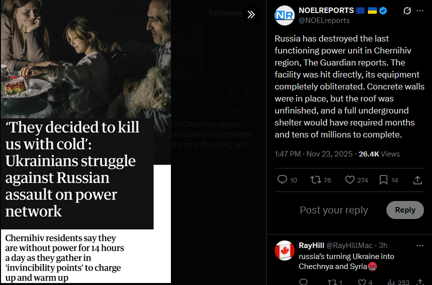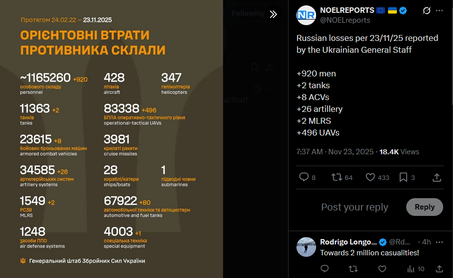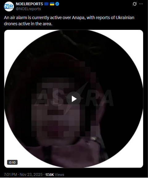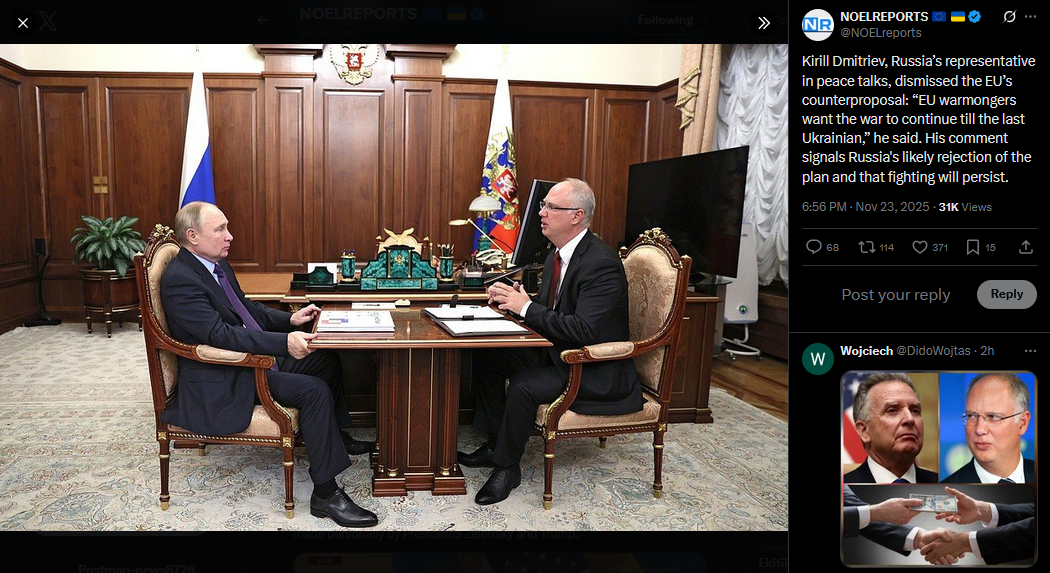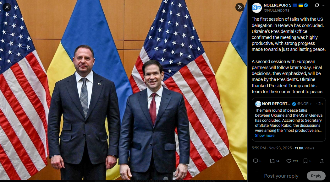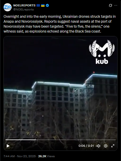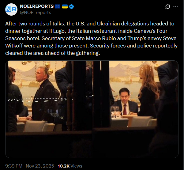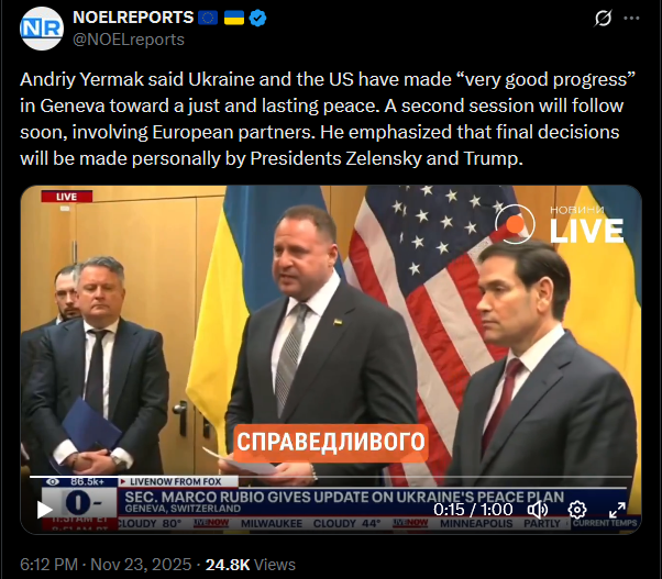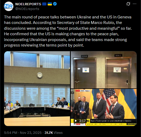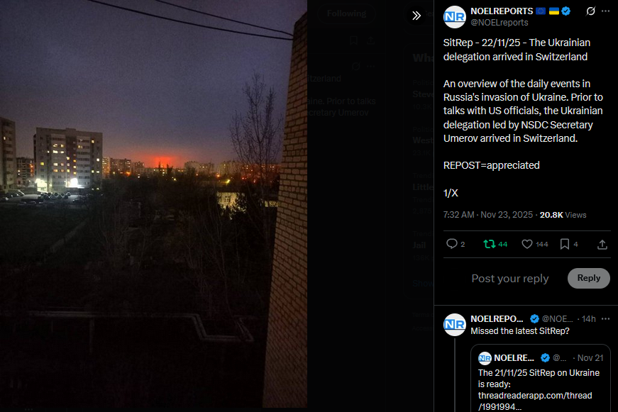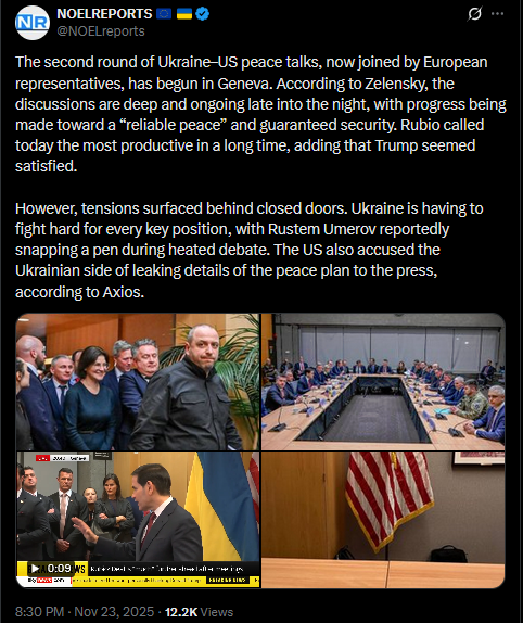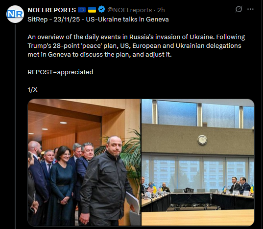 SitRep - 23/11/25 - US-Ukraine talks in GenevaAn overview of the daily events in Russia's invasion of Ukraine. Following Trump's 28-point 'peace' plan, US, European and Ukrainian delegations met in Geneva to discuss the plan, and adjust it.https://x.com/NOELreports/status/1992703408416194636?s=20