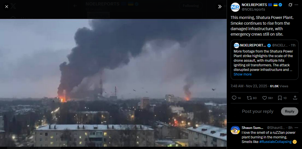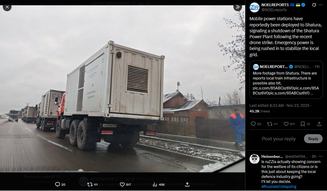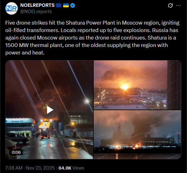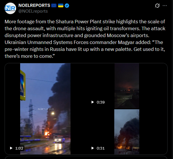 Previous: >>522075668Day 1,369 – Daily assessment: https://understandingwar.org/analysis/russia-ukraine/#research▶Latest>Tremendous amount of progress in the Geneva talks with Ukraine, there are a couple of issues we need to work on, none of them are insurmountable, we just need more time than we had today. I honestly believe we'll get there. - Rubio>Shatura Plant in mosquew oblast got hit by drones>Rubio announces that the 28 point peace plan was a russian document, not US one>Zelenskyy discussed latest "peace" plan with NATO Sec.Gen and European partners>Zelenskyy says he won't betray Ukraine>Germany confirms long-range missiles to be acquired by Ukraine>Another Ryazan reFINEry visition + Kursk substation hits>Ukraine says it used an ATACMS on russian territory>Refineries in Samara + Ryazan regions hit>Voronezh missile engine factory hit>Major Ukie Drone Strike Halts Oil Deliveries at Novorossiysk Terminal>Su-30SM crashed in Karelia, all crew dead>Flamingo flew to Tuapse + NOVOPUSSYISK was hit separately three times at once: port, oil storage, ammo dump>The first russian region announced an Internet shutdown until the end of the war>The US has frozen negotiations with russia on normalizing relations>Duma deputy Nikolai Arefiev announced that russian citizens have “become impoverished”>Ukraine targets russian energy facilities in Taganrog + Voronezh>Azeris have transferred to NATO doctrine, abandoning russian doctrine citing it as ineffective▶Telegramhttps://rentry.org/telosint2023https://t.me/ukr_pics▶Intelhttps://t.me/DeepStateENhttps://odin.tradoc.army.mil/WEG (equipment explorer)https://ukr.warspotting.net (visually confirmed losses)▶Mapshttps://deepstatemap.live/enhttps://liveuamap.com/en▶DISPOSABLE SOLDIER (diary of a RU mobik)TOUR 1: files.catbox.moe/34fuhc.txtTOUR 2: files.catbox.moe/uj2wut.txtTOUR 3: files.catbox.moe/hmyd98.txtTOUR 4: files.catbox.moe/cdenxe.txt