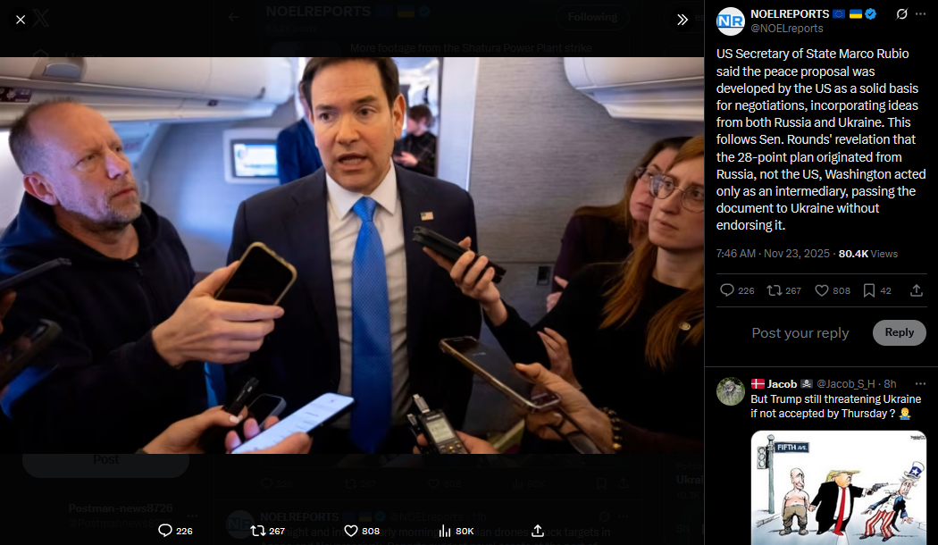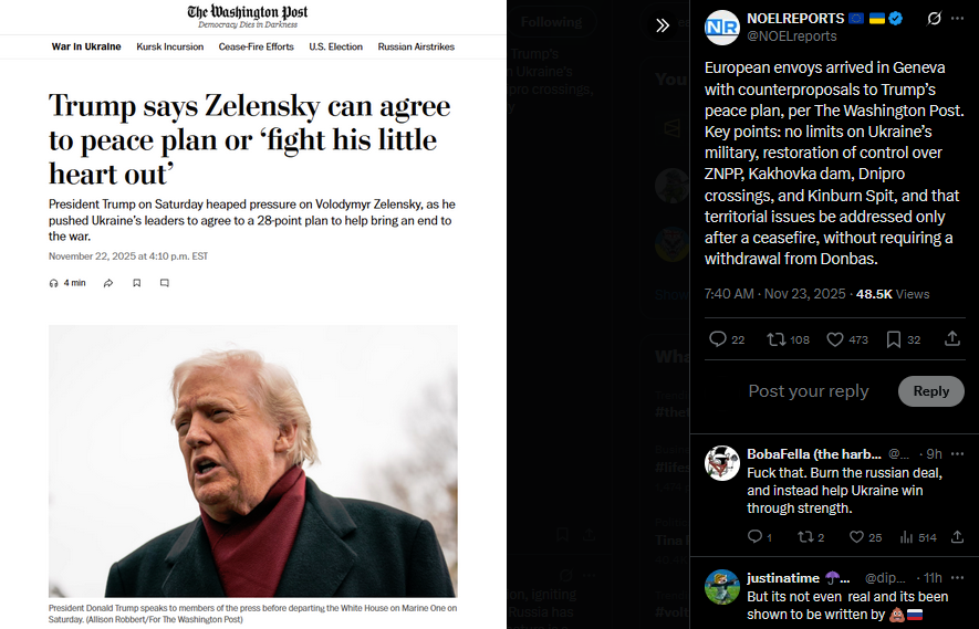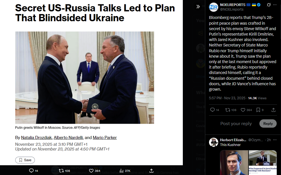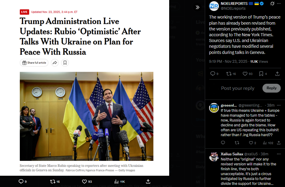 >>522092380The working version of Trump’s peace plan has already been revised from the version previously published, according to The New York Times. Sources say U.S. and Ukrainian negotiators have modified several points during talks in Geneva.https://x.com/NOELreports/status/1992704501866967219?s=20