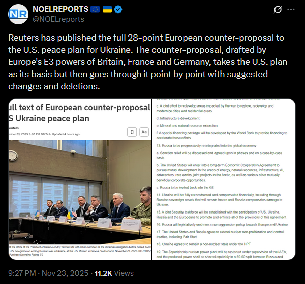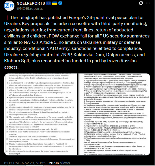 >>522091201>>522091119Reuters has published the full 28-point European counter-proposal to the U.S. peace plan for Ukraine. The counter-proposal, drafted by Europe's E3 powers of Britain, France and Germany, takes the U.S. plan as its basis but then goes through it point by point with suggested changes and deletions.https://x.com/NOELreports/status/1992706502222586041?s=20pic 1https://files.catbox.moe/yth80d.pngpic 2https://files.catbox.moe/6fbgch.pngThe EU counter-proposal caps Ukraine’s army at 800,000, bans NATO troops in Ukraine during peacetime, and restarts ZNPP under IAEA with a 50/50 energy split. Ukraine can’t reclaim occupied land by force. Russia could rejoin G8, sanctions eased in phases. US guarantees apply only if Kyiv doesn’t strike Russia. Trump would chair a “Board of Peace.” Ceasefire begins once signed; US would monitor troop pullbacks. Frozen Russian assets to fund Ukraine’s reconstruction.https://x.com/NOELreports/status/1992706824030605740?s=20>Russia doesn't do argreements, and there was a 1994 agreement signed on a piece of paper, how did that go?