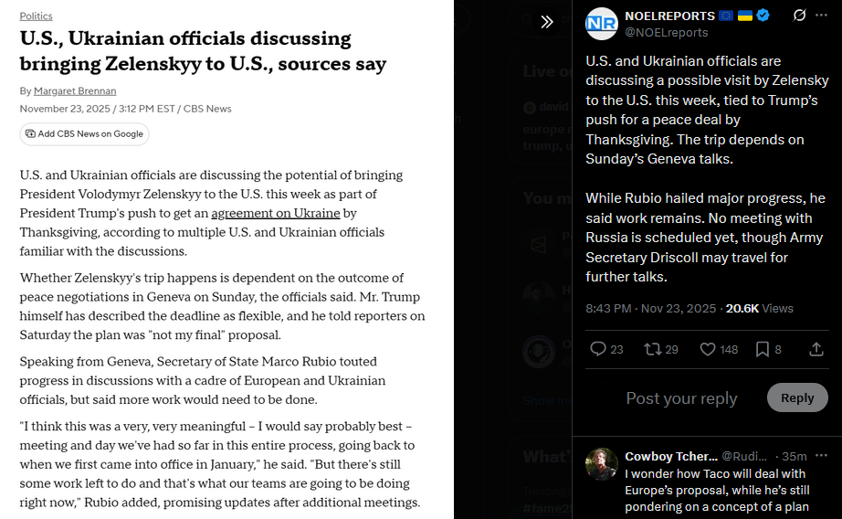 >>522091921U.S. and Ukrainian officials are discussing a possible visit by Zelensky to the U.S. this week, tied to Trump’s push for a peace deal by Thanksgiving. The trip depends on Sunday’s Geneva talks. While Rubio hailed major progress, he said work remains. No meeting with Russia is scheduled yet, though Army Secretary Driscoll may travel for further talks.https://x.com/NOELreports/status/1992695603906920717?s=20>sounds like standard Trump talk, I heard/feel it was a shitshow