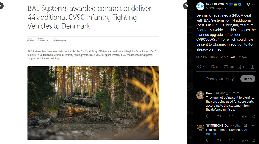Denmark has signed a $450M deal with BAE Systems for 44 additional CV90 Mk.IIIC IFVs, bringing its future fleet to 159 vehicles. This replaces the planned upgrade of its older CV9035DKs, 44 of which could now be sent to Ukraine, in addition to 40 already planned.https://x.com/NOELreports/status/1992708909233225839?s=20
