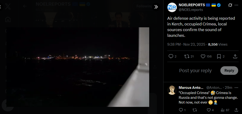 Air defense activity is being reported in Kerch, occupied Crimea, local sources confirm the sound of launches.https://x.com/NOELreports/status/1992709345298239877?s=20>>522092894 there is Eastern EU and then there is the Golden Horde (Russia)