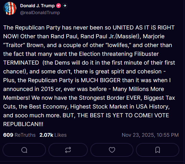 The Republican Party has never been so UNITED AS IT iS RIGHT NOW! Other than Rand Paul, Rand Paul Jr.(Massie!), Marjorie “Traitor” Brown, and a couple of other “lowlifes,” and other than the fact that many want the Election threatening Filibuster TERMINATED (the Dems will do it in the first minute of their first chance!), and some don’t, there is great spirit and cohesion - Plus, the Republican Party is MUCH BIGGER than it was when I announced in 2015 or, ever was before - Many Millions More Members! We now have the Strongest Border EVER, Biggest Tax Cuts, the Best Economy, Highest Stock Market in USA History, and sooo much more. BUT, THE BEST IS YET TO COME! VOTE REPUBLICAN!!!https://truthsocial.com/@realDonaldTrump/posts/115601476787319590