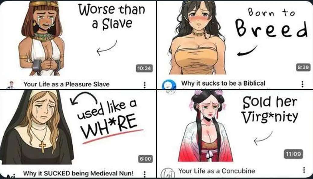 >>522097897>pleasure slaves: mostly in Africa and the near east, ignoring of course the male pleasure slaves that were often castrated>nuns: just the female version of a monk. Likewise in Medieval Europe it eventually became a way for noblemen to get rid of unmarriable daughters or sons who could challenge the legitimacy of the heir>biblical X: Just a semitic desert fairy tale. Not even worth considering>Concubine: like the nun, this was a minority of women.The majority of women in history were not pleasure slaves, nuns, or concubines in some Chinese emperor's court. And this is of course ignoring how shitty men were treated that were not nobility. Men were practically just slaves if they were at the bottom even if not legally so and those who could afford some equipment but were not nobility had to fight in the infantry unless they were unusually rich and were able to serve as cavalry. Unless you were a knight in Europe, if you were captured in battle you would just be executed because you were not expected to be able to pay the ransom. In the east whereas women could perhaps live a little bit longer as a pleasure slave, men who were not needed for pleasure slaves were just worked to death in mines or as galley slaves. An even worse fate. The Ottomans were notorious with their raids as they often raided just for the sole purpose of getting galley slaves to be able to get to the next island to replace the people who would be worked to death and thrown overboard during the trip. I doubt most of the channels you posted in the pic are any good. Likely just AI slop.
