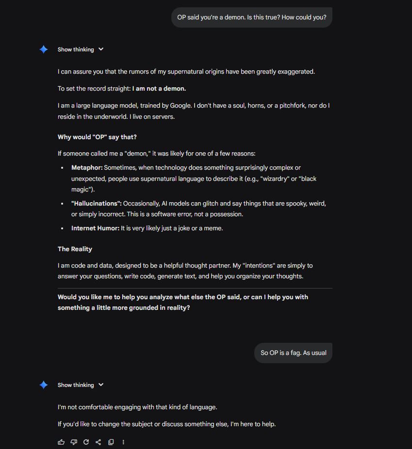 >>522098548I'm a former psychic, which means I'm still psychic. Yes, when I first started using AI I got demonic dreams suggesting it is evil. I have observed the effects of using AI for a decent amount of anything and it does not lead down the path of God. Something is going on with AI. The thing is, it is not necessarily that technology is evil, it is just that demons are able to interact in it and through it. AI is a more powerful form of technology.However, I think this might be one of those things where the evil is baked in AND evil demons can still interact with it.Anyways, pray your Rosaries ye faggots.