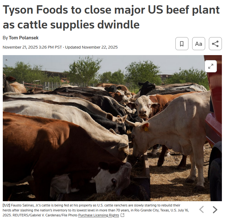 man i wonder who they voted for lol>Tyson Foods will close a beef plant in Lexington, Nebraska, with about 3,200 employees after U.S. cattle supplies dropped to their lowest level in nearly 75 years, the meatpacker said on Friday.>Beef prices have set records due to low supplies and strong demand, raising costs for consumers. U.S. President Donald Trump said last month that he was working to bring down beef prices.https://www.reuters.com/business/tyson-foods-close-us-beef-plant-cattle-supplies-dwindle-2025-11-21/