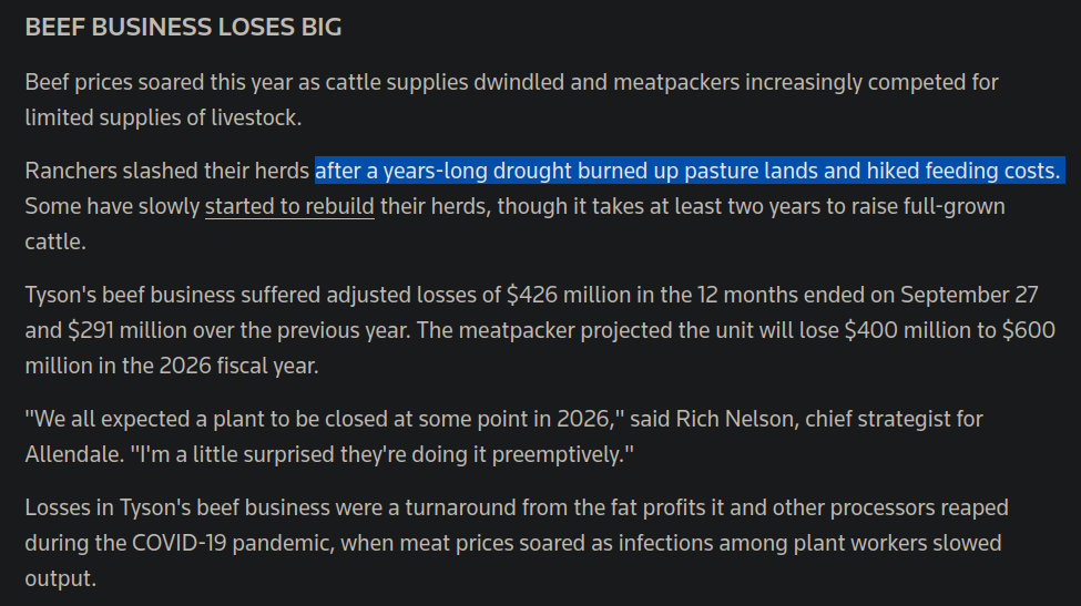 >>522100152What you don’t understand is this about crop failures, nothing else Farmers have to supplement cattle feed and prices have been going through the roof for 3 years now The media barely talks about it but it’s very obvious when you start reading agriculture publications