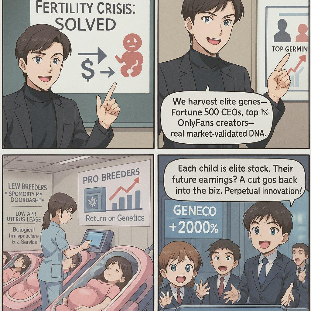 >>522100278This is a horrible idea.Most fortune 500 owners are nepobabies and didn't get to where they are through pure genetic superiority, but through careful manipulation and luck.If you want the superior genes you'd supply a healthy stock of the guy who can survive on minimum dollars and his own hard labor regularly into the mixture. Otherwise the offspring will continue to weaken until they can no longer protect themselves from natural born hordes.