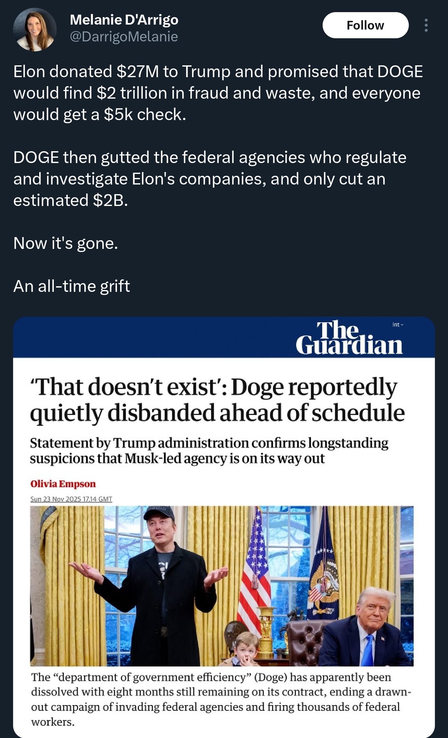 Elon got swindled actually it was never about saving money and always anti corruption. Most of the people he took out were his own LOL