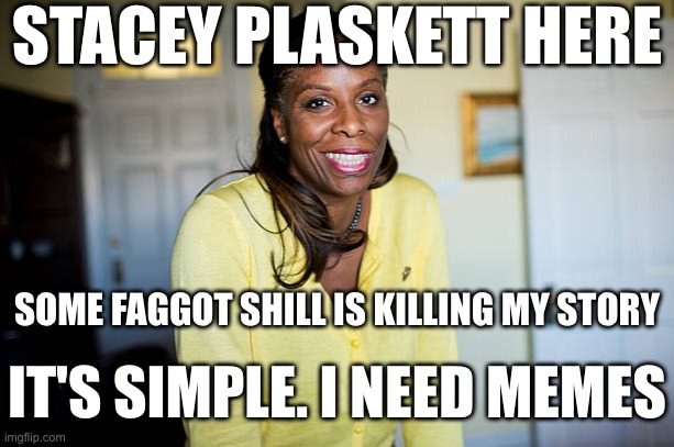 The shilling is getting out of hand, but everyone that isn't a bot needs to realize just making memes, and not engaging is what needs to be done. It is really simple, make a meme. I don't give a shit what the topic is, who its about, just make a meme, drop a meme, and something fun might come up. These fucking feds arent allowed to have fun at work, and any fedtype meme will be obvious. That dumb nigger stacey plaskett shouldve been meme'd out already but they took a White Goblin in MTG instead. eye for an eye as the jews sayhttps://archive.4plebs.org/pol/thread/521753171/#521753171you can pull plaskett info from there. id avoid the faggot shill plaskett threads that start with a fuck ton of green text, because thats the best way to convey a message to the dumb fuck population, A LOT OF FUCK WORDS One rule: drop one meme at least