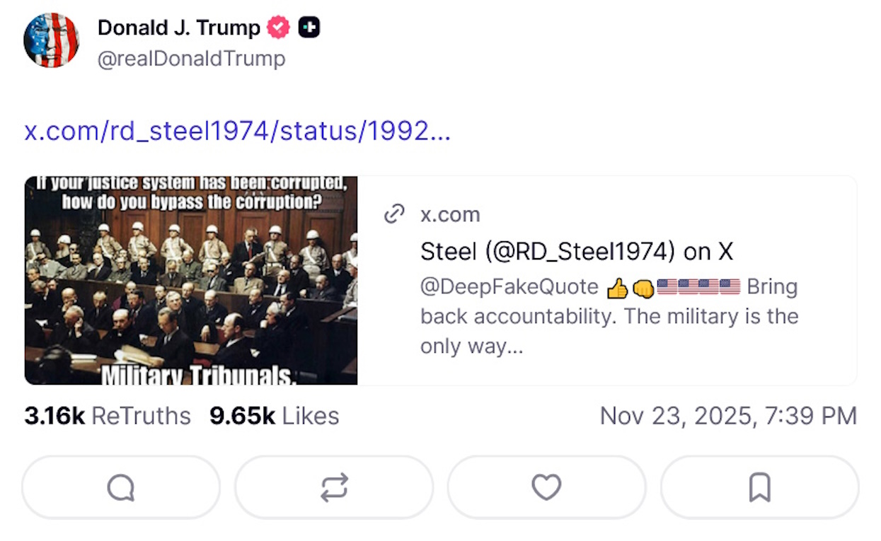 If your justice system has been corrupted, how do you bypass the corruption?Military Tribunals.https://truthsocial.com/@realDonaldTrump/posts/115601883571083274