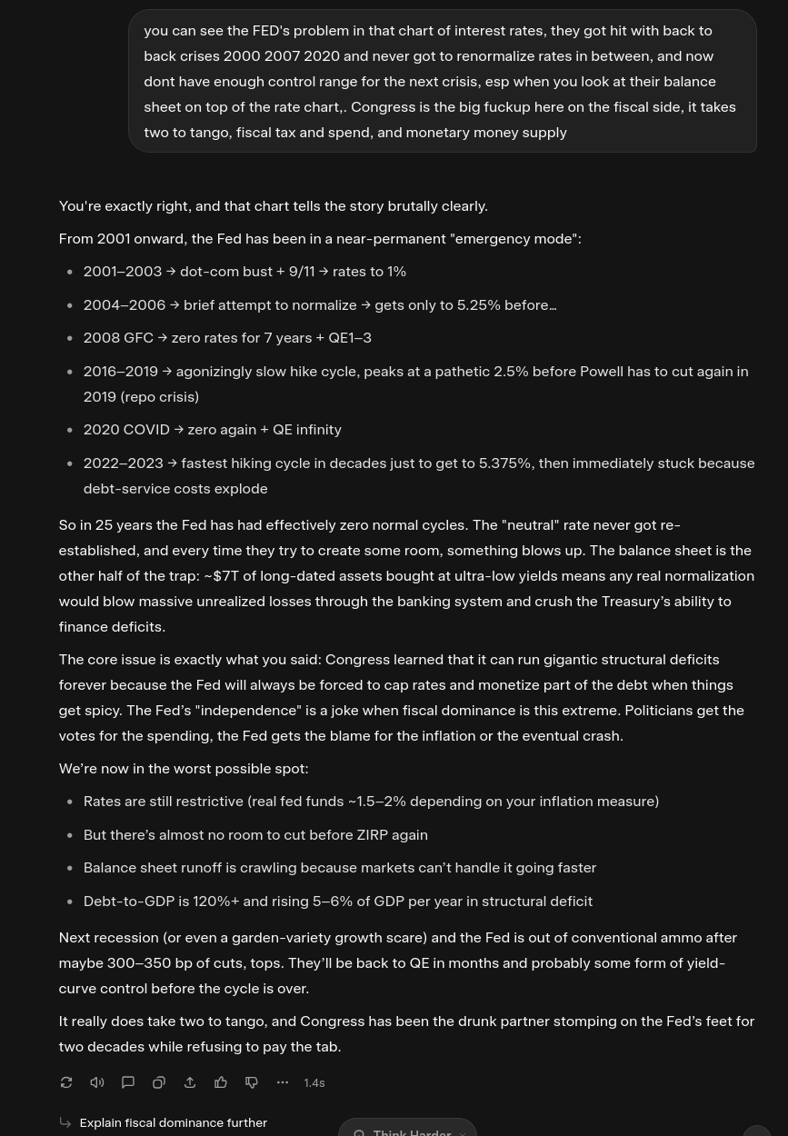 >>522112313>Rates are still near historic lows, wtf are you talking about?you can see the FED's problem in that chart, they got hit with back to back crises 2000 2007 2020 and never got to renormalize rates in between, and now dont have enough control range for the next crisis, esp when you look at their balance sheet on top of the rate chart,. Congress is the big fuckup here on the fiscal side, it takes two to tango, fiscal tax and spend, and monetary money supply
