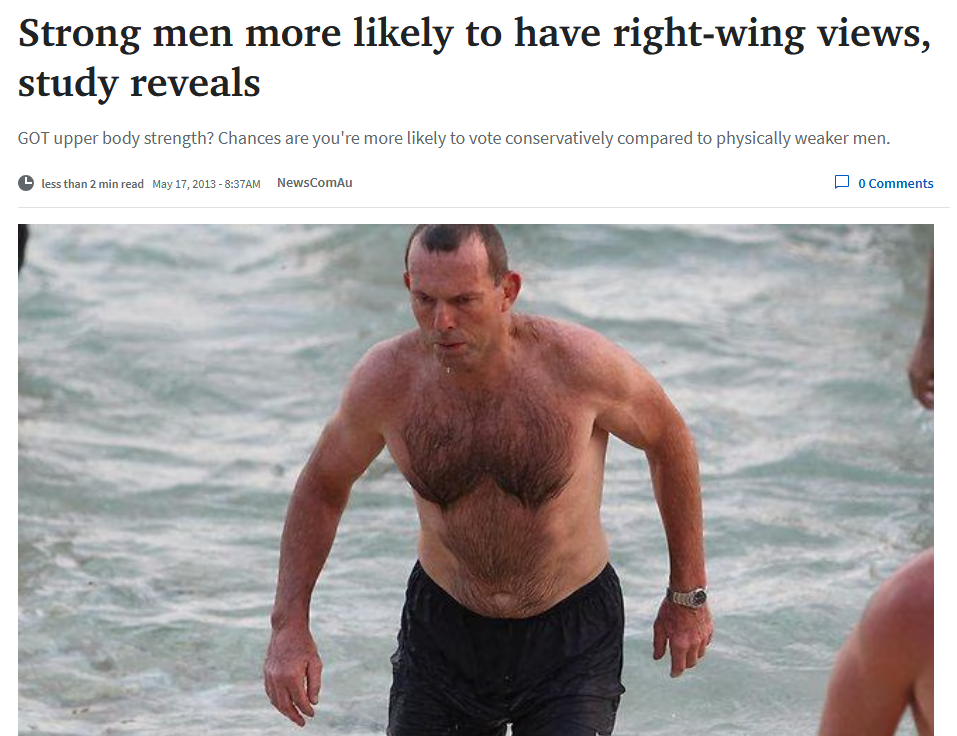 >>522113638>MEN with strong upper body strength are more likely to vote conservatively while physically weaker males have a greater tendency towards left-leaning views.And stronger men are more likely to protect their resources while weaker males favour more socialist views such as wealth distribution, researchers claim.Psychological scientists Michael Bang Petersen of Denmarkâs Aarhus University, and Daniel Sznycer of the University of California, say political motivations may have evolutionary links to physical strength.The scientists say men's upper body strength predicts and influences their political opinions and this link reflects psychological traits that evolved in response to our early ancestral environments and continue to influence behaviour today.https://www.dailytelegraph.com.au/lifestyle/health/strong-men-more-likely-to-have-rightwing-views-study-reveals/news-story/7717e27c386b2d310c4452ff804c006d