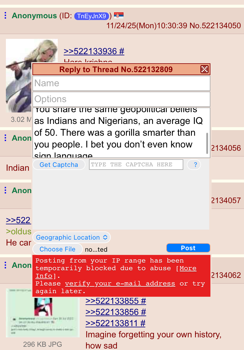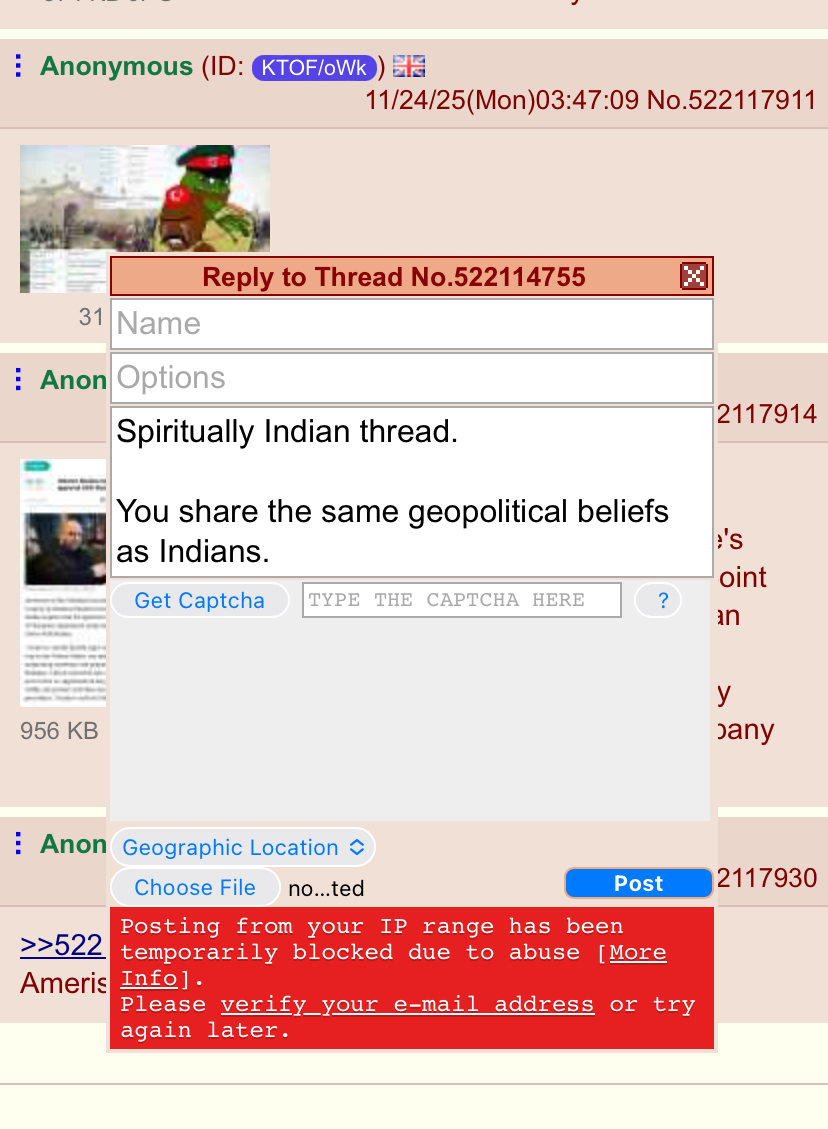 >>522132274that happens to me when I shitpost from my mobile network too often irrespective of the topic. they range ban mobile network IPs