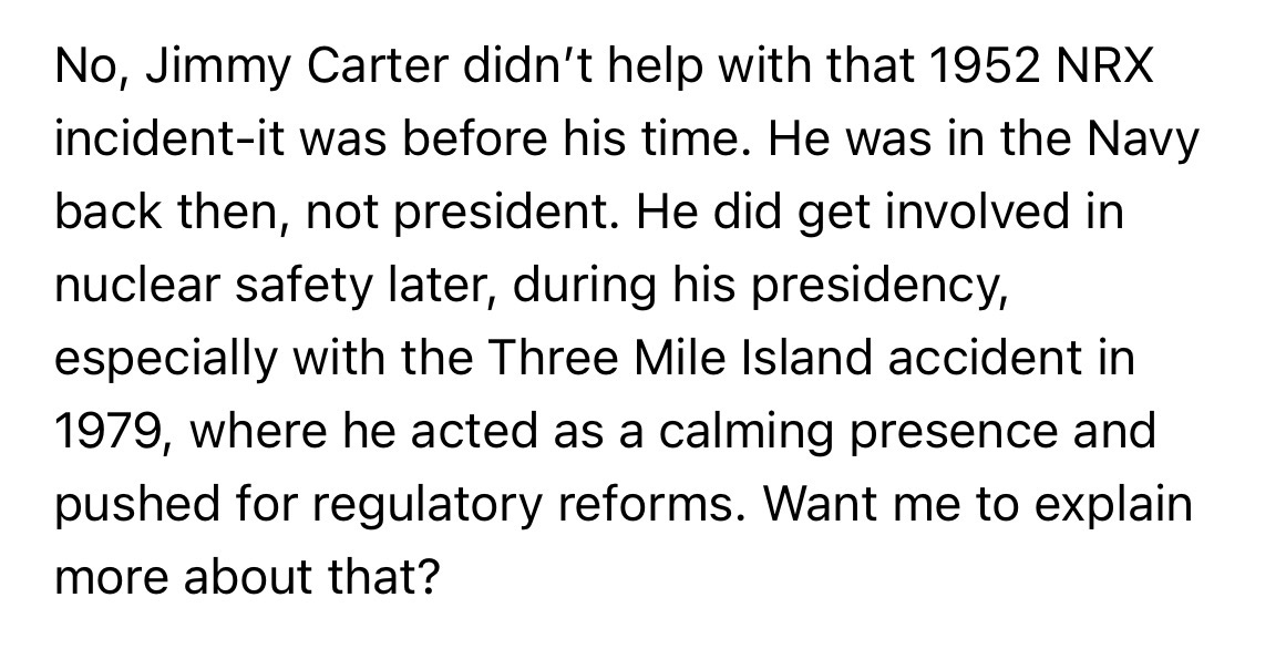 >>522140808Jimmy Carter and his team worked in 90 second shifts to avoid receiving deadly levels of radiation. They had to build a replica of the reactor and train for weeks to memorize every last movement they were gonna make before going in for real to do their 90 seconds of work and get out and even just from that 90 seconds his piss was radioactive for months.