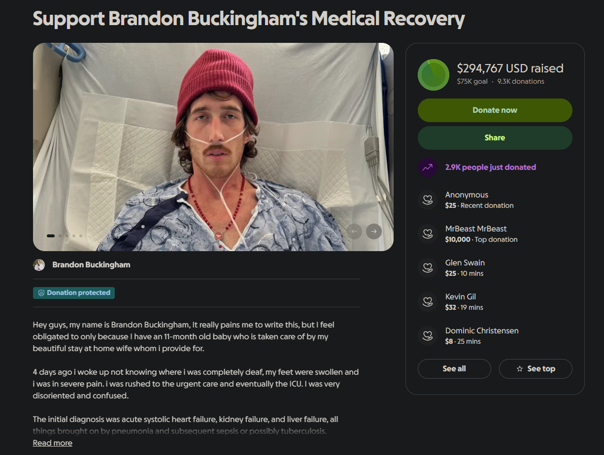 >>522196421He's friends with multiple multi-millionaire youtube slop creators. Why haven't any of them donated some big bux to him? Mr Beast is the only name I see there and he donated pocket change (for him) of $10k.