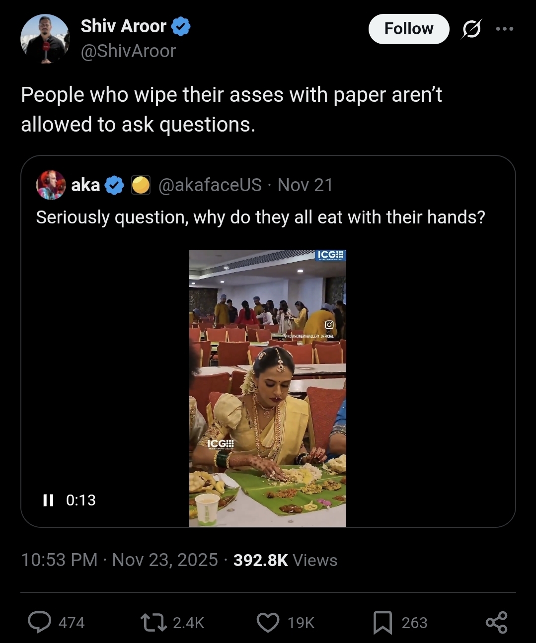 Hm, considering 70% of homes in india don't have a toilet and there is a massive clean water crisis there what do most indians wipe their asses with? Oh yeah, the same hands they eat with...