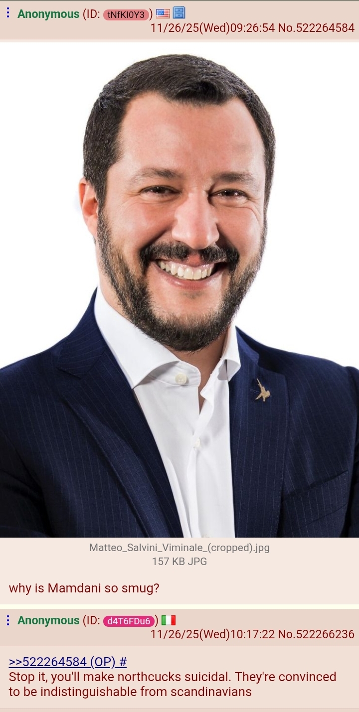 >>522308824>The fact that most people here don't know this gives away how non-white they are>USA flaglol americans are mixed with like 5 different ethnicities on average, you have no agency calling anyone else non-white.