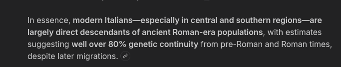 >>522308836>Italians aren't white. They love to we wuz as Romans though (who they share no genetic linage anymore)Ancient Italians are almost identical to modern Italians, the difference is merely the changes within the same population over time plus a few extra-admixture from the South.