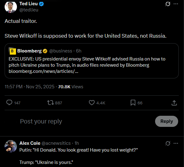 Actual traitor.Steve Witkoff is supposed to work for the United States, not Russia.https://x.com/tedlieu/status/1993469041701535768?s=20>EXCLUSIVE: US presidential envoy Steve Witkoff advised Russia on how to pitch Ukraine plans to Trump, in audio files reviewed by Bloomberg https://www.bloomberg.com/news/articles/2025-11-25/witkoff-advised-russia-on-how-to-pitch-ukraine-plan-to-trump