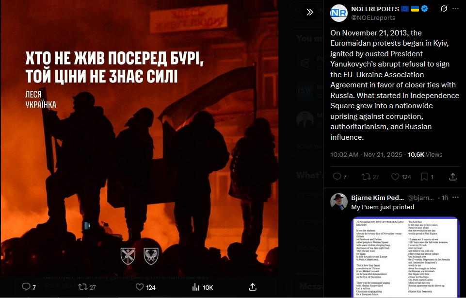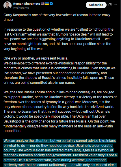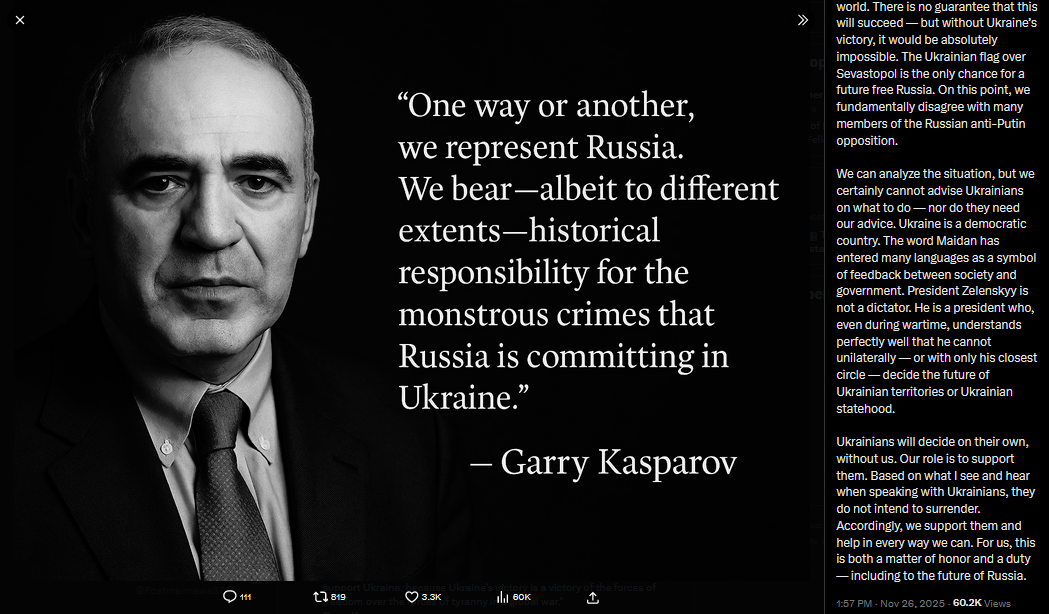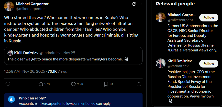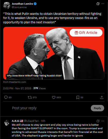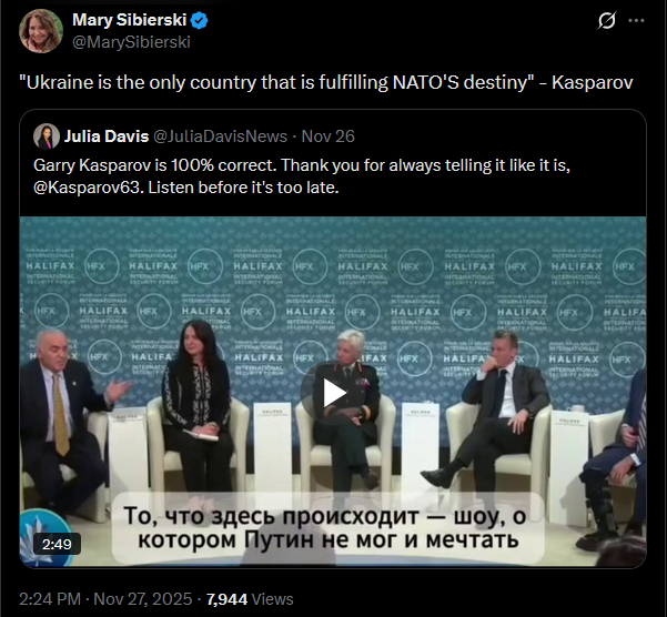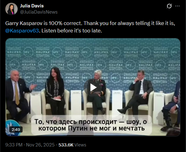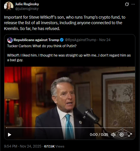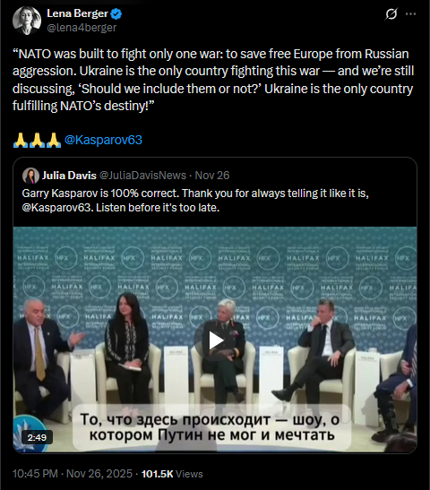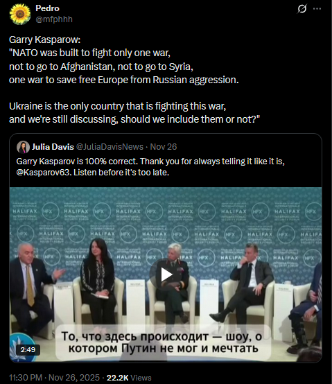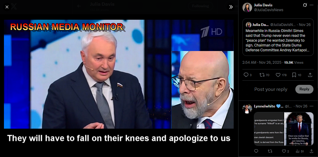 Meanwhile in Russia: Dimitri Simes said that Trump never even read the "peace plan" he wanted Zelensky to sign. Chairman of the State Duma Defense Committee Andrey Kartapolov said Europeans will have to kneel before Russia if it wins in Ukraine.https://x.com/JuliaDavisNews/status/1993512642678603995?s=20https://www.youtube.com/watch?v=xRVcJFKt0pY&list=PLLWQyEN3YRo41QwWb7e8J5YjBX80WmGtG