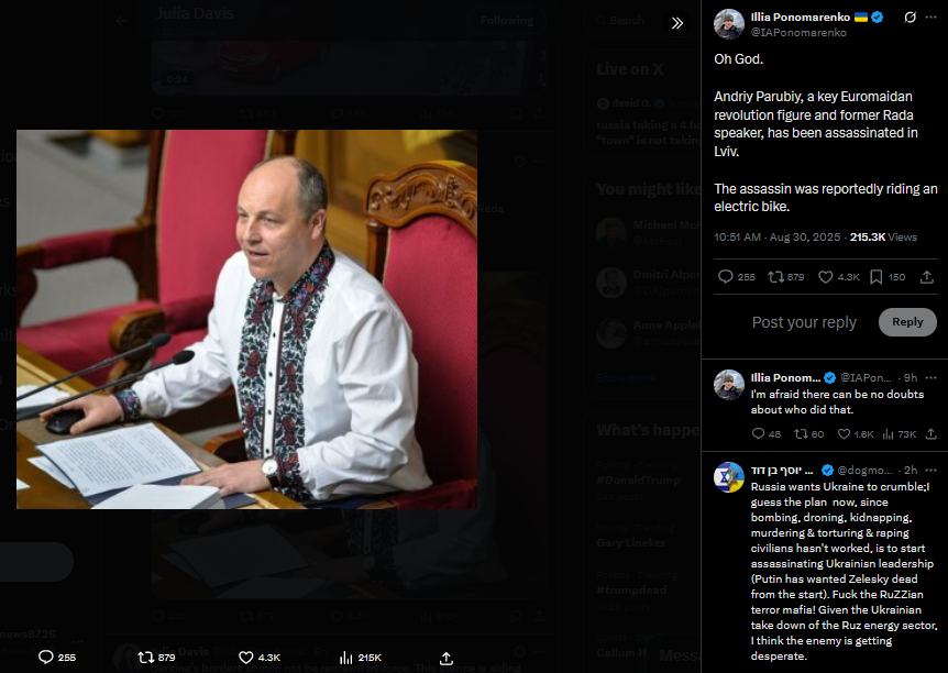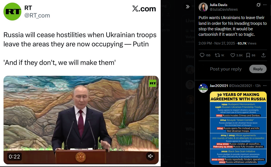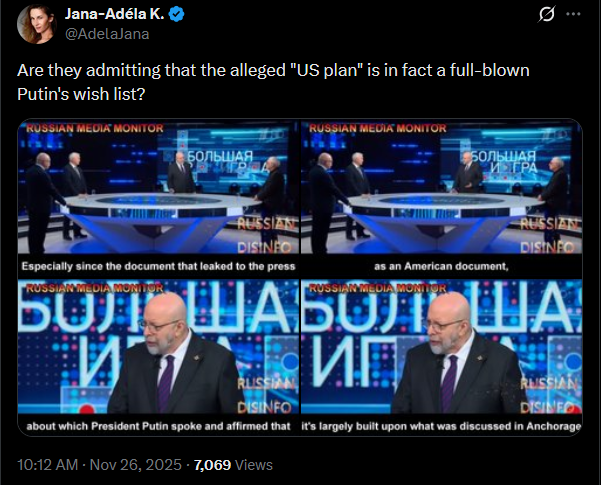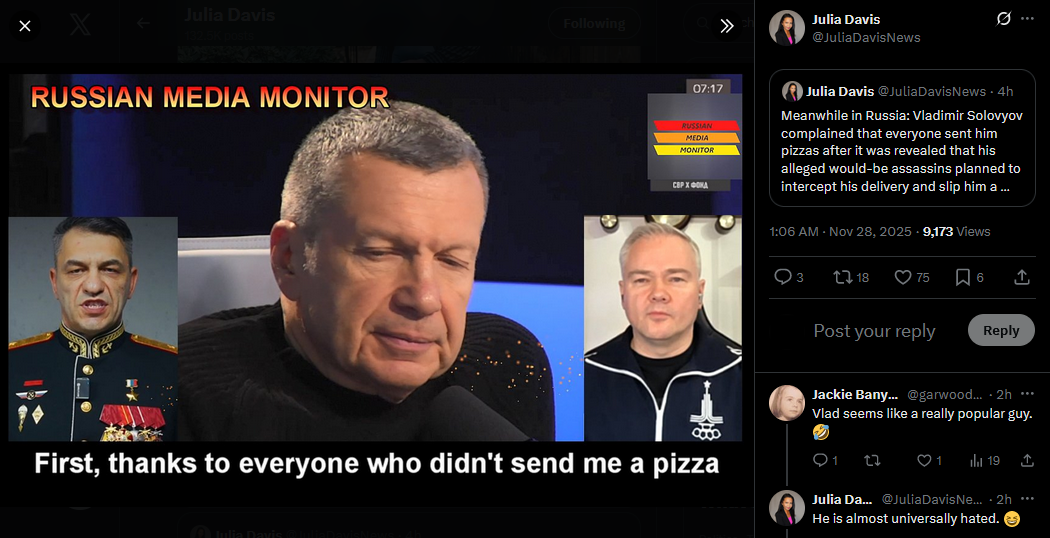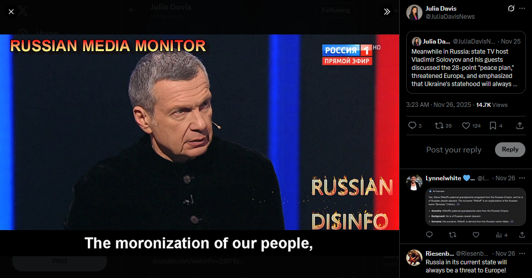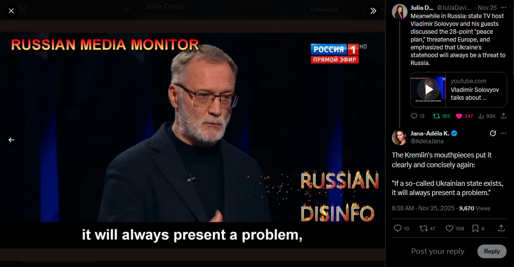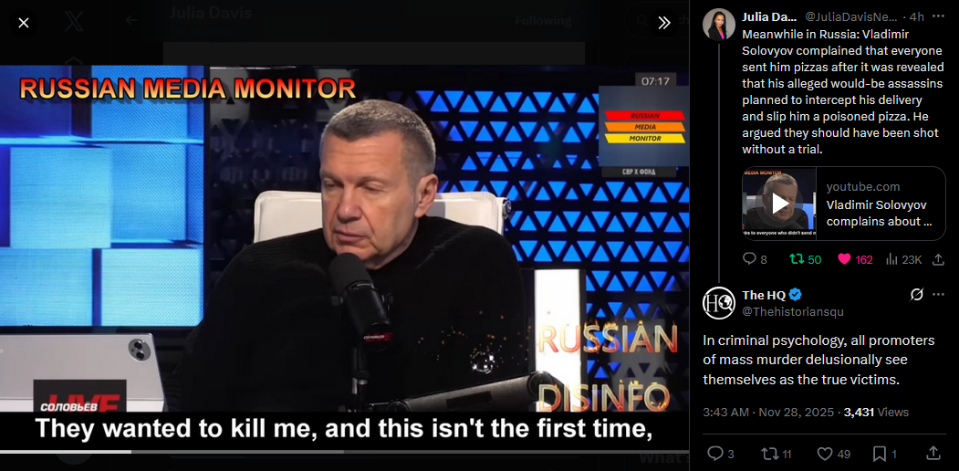 https://x.com/JuliaDavisNews/status/1993521066283819065?s=20>Meanwhile in Russia: state TV host Vladimir Solovyov and his guests discussed the 28-point "peace plan," threatened Europe, and emphasized that Ukraine's statehood will always be a threat to Russia.>https://x.com/JuliaDavisNews/status/1993168579215376595?s=20https://www.youtube.com/watch?list=PLLWQyEN3YRo41QwWb7e8J5YjBX80WmGtG&time_continue=4&v=QJ9TBztaaPY&embeds_referring_euri=https%3A%2F%2Fx.com%2F&source_ve_path=MzY4NDIsMjg2NjY