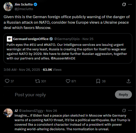 >>522404521Given this is the German foreign office publicly warning of the danger of a Russian attack on NATO, consider how Europe views a Ukraine peace deal which favors Moscow.https://x.com/jimsciutto/status/1993529350676005334?s=20>Putin eyes the #EU and #NATO. Our intelligence services are issuing urgent warnings: at the very least, Russia is creating the option for itself to wage war against NATO by 2029. We have to deter further Russian aggression, together with our partners and allies. @AussenMinDE