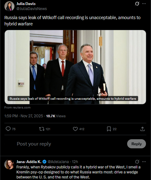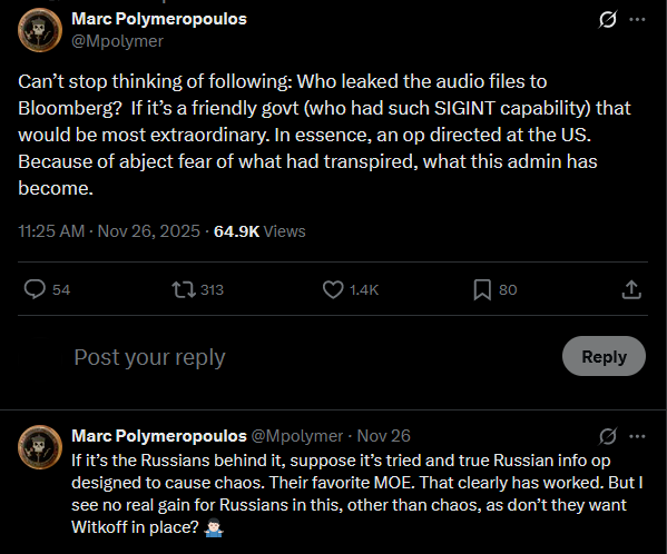 >>522404521Can’t stop thinking of following: Who leaked the audio files to Bloomberg? If it’s a friendly govt (who had such SIGINT capability) that would be most extraordinary. In essence, an op directed at the US. Because of abject fear of what had transpired, what this admin has become.https://x.com/Mpolymer/status/1993642166858781027?s=20If it’s the Russians behind it, suppose it’s tried and true Russian info op designed to cause chaos. Their favorite MOE. That clearly has worked. But I see no real gain for Russians in this, other than chaos, as don’t they want Witkoff in place?