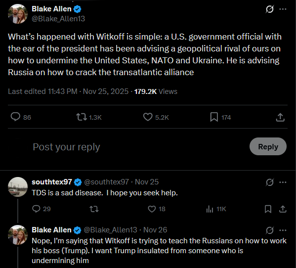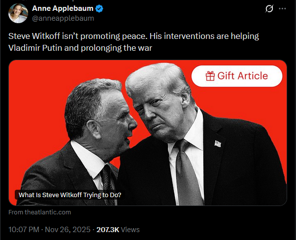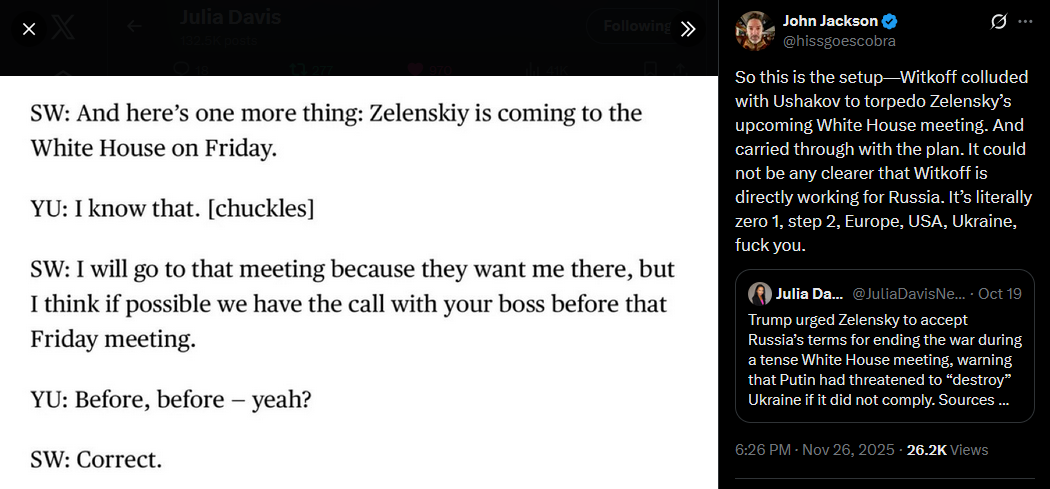 >>522404521So this is the setup—Witkoff colluded with Ushakov to torpedo Zelensky’s upcoming White House meeting. And carried through with the plan. It could not be any clearer that Witkoff is directly working for Russia. It’s literally zero 1, step 2, Europe, USA, Ukraine, fuck you.https://x.com/hissgoescobra/status/1993748174763380982?s=20