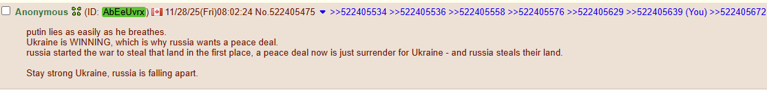 >>522404773The Kremlin's mouthpieces put it clearly and concisely again:"If a so-called Ukrainian state exists, it will always present a problem."https://x.com/AdelaJana/status/1993207703699963984?s=20>>522404775 sure, but only in green